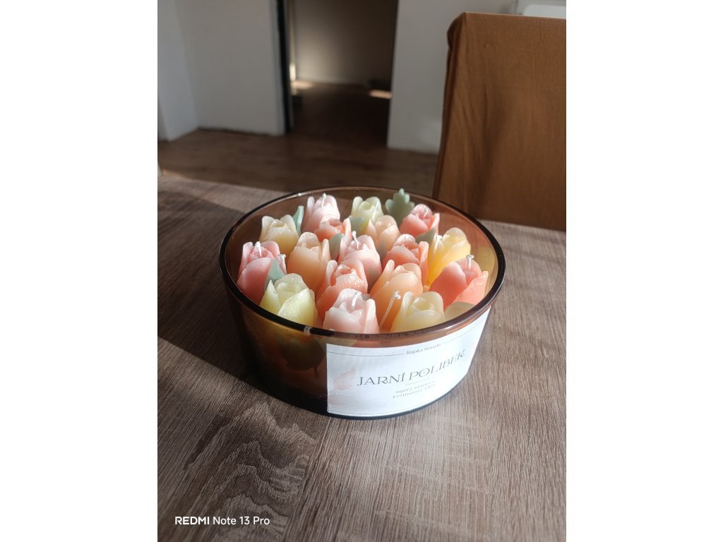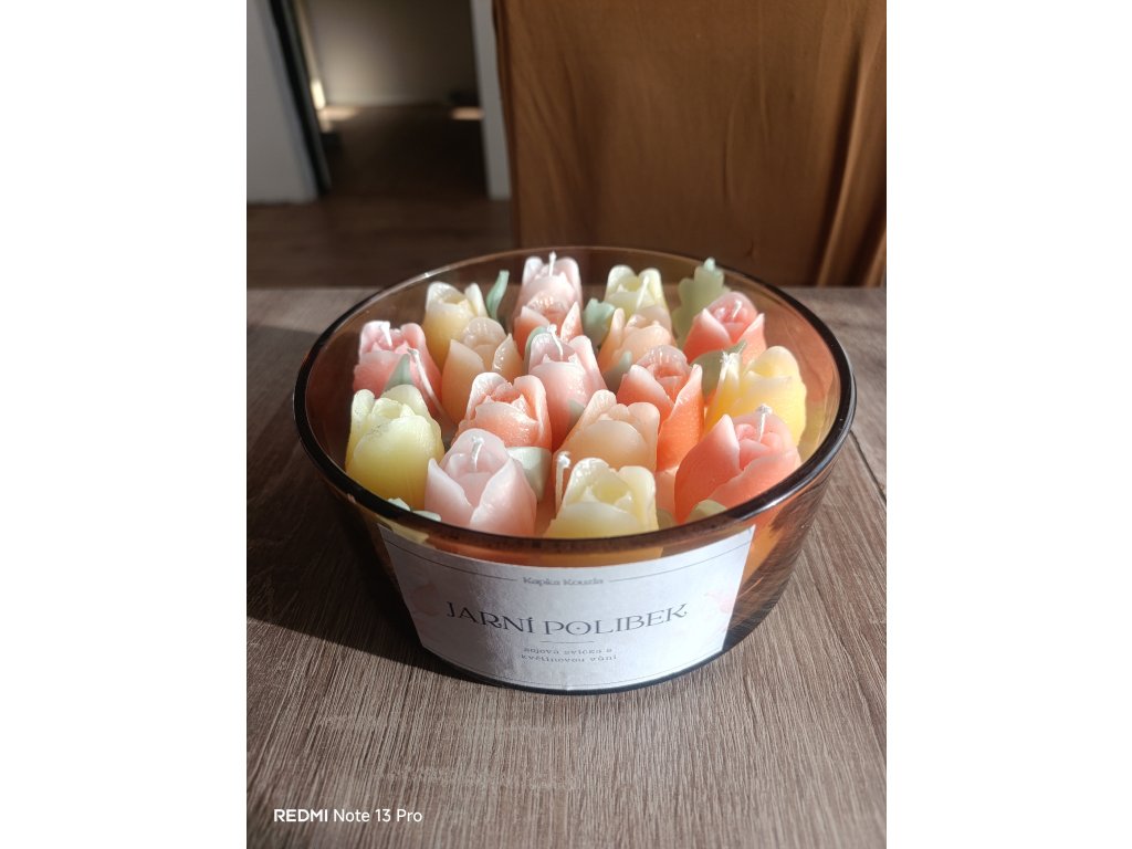 Designová svíčka v hnědém skle s bohatým zdobením v podobě barevných tulipánů. Perfektní dárek pro milovníky jara a květinových vůní.