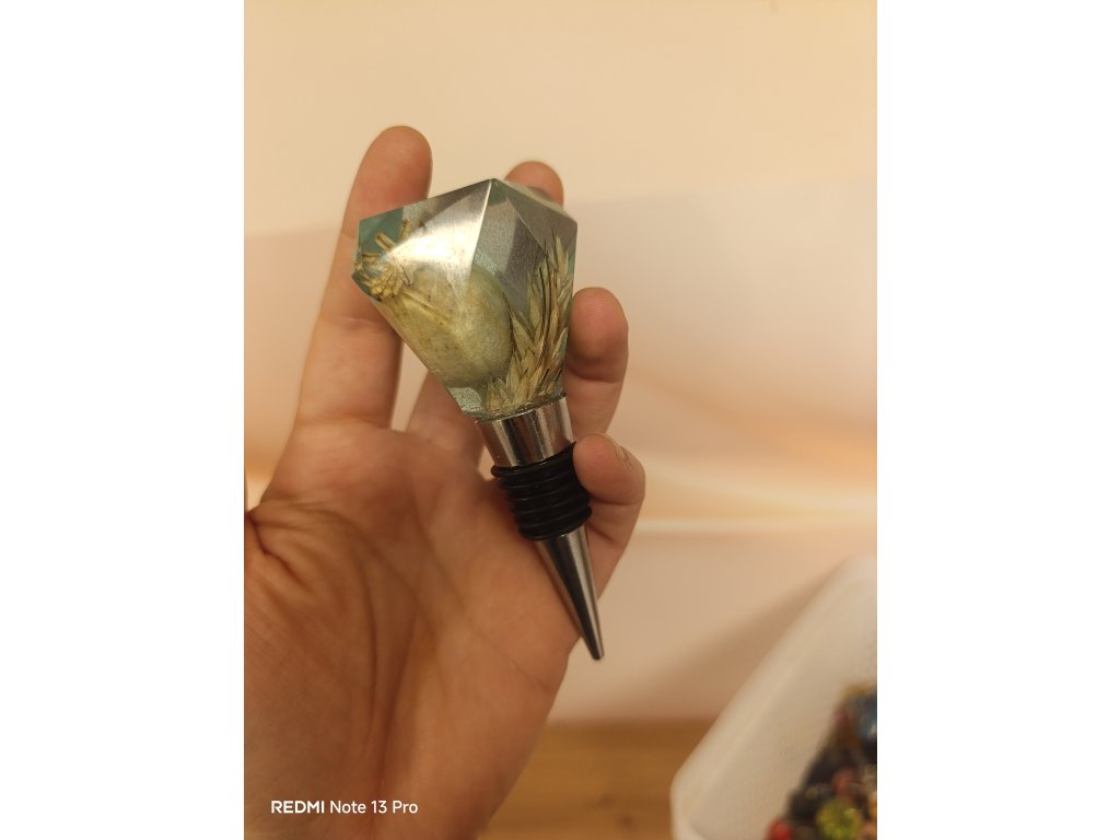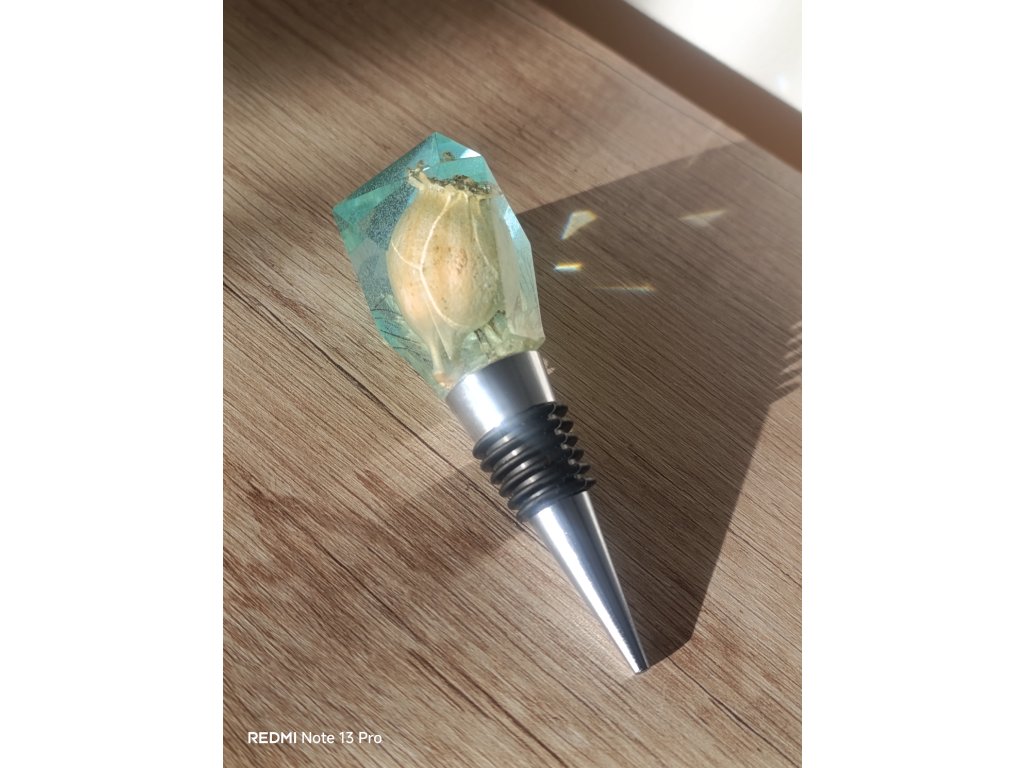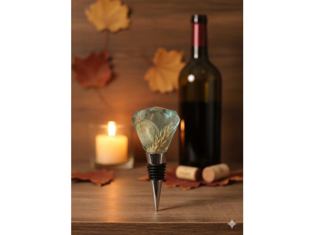 Pozvedněte rituál pití vína na novou úroveň. Naše ručně vyráběná zátka není jen praktickým pomocníkem, ale malým uměleckým dílem. V průzračném vrcholu ve tvaru vybroušeného diamantu jsou zality sušené plody a klasy, které připomínají kouzlo podzimu a sklizně.